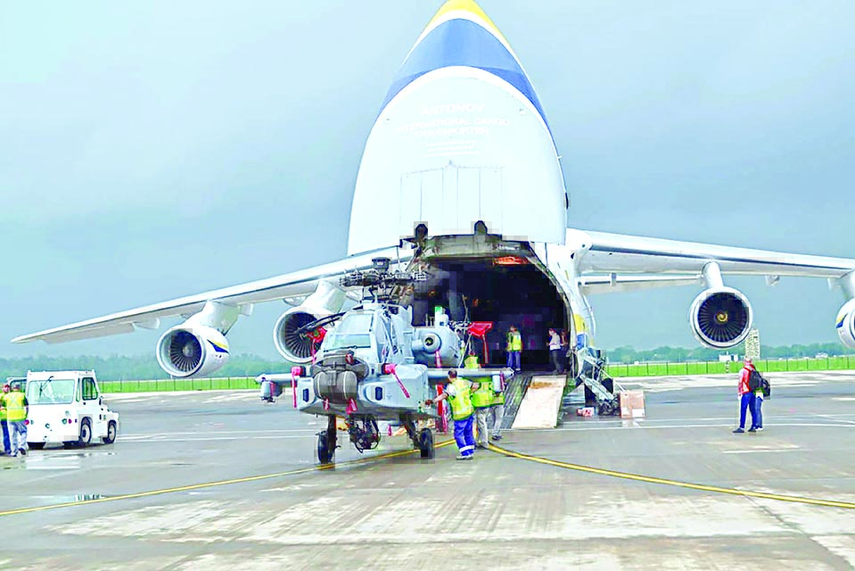 An Apache helicopter being offloaded from an Antonov AN 224 Transport Aircraft at Indian Air Force’s Hindon Airbase in Ghaziabad