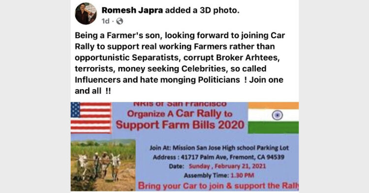 In a shocking incident that happened in California (USA), eminent Cardiologist Dr Romesh Japra’s house was attacked by Khalistanis for supporting the three new farm bills passed by the Modi government. On February 20th, Dr Romesh Japra had requested his followers to join a car rally to support farm bills on Facebook. He posted, “Being a Farmer’s son, looking forward to joining Car Rally to support real working Farmers rather than opportunistic Separatists, corrupt Broker Arhtees, terrorists, money-seeking Celebrities, so-called Influencers and hate-mongering Politicians! Join one and all !!” This request irked Khalistanis, they launched an online hate campaign against him and later his house was attacked.
