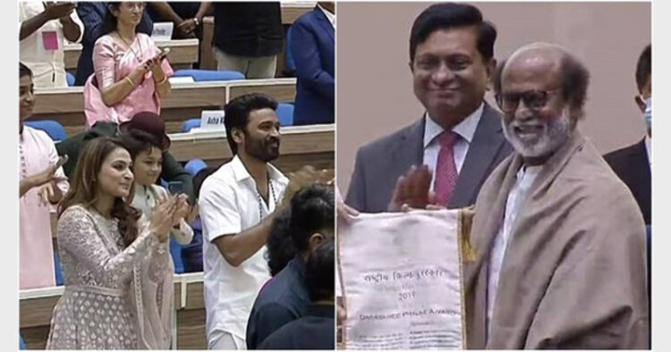 Rajinikanth attended the presentation ceremony along with his wife Latha, daughter Aishwarya, and son-in-law Dhanush.
