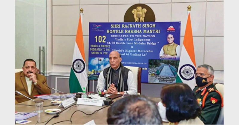 Raksha Mantri Shri Rajnath Singh dedicated to the Nation 24 bridges and three roads, built by BRO in four States and two Union Territories, through a virtual event on December 28, 2021. Of the 24 bridges, nine are in Jammu and Kashmir; five each in Ladakh and Himachal Pradesh; three are in Uttarakhand and one each in Sikkim and Arunachal Pradesh. Of the three roads, two are in Ladakh, and one is in West Bengal. The main highlight was the inauguration of India’s first indigenous Class 70 140-feet Double-Lane Modular Bridge, built at the height of 11,000 feet at Flag Hill Dokala, Sikkim and Chisumle-Demchok road at Umling La Pass at over 19,000 feet in Ladakh, which also holds the Guinness World Record of world’s highest motorable road. Raksha Mantri described the indigenous Double-Lane Modular Bridge as a shining example of ‘Aatmanirbharta’ and appreciated that it has been developed at a much lower cost and can be dismantled need be. The e-inauguration has taken the tally of infrastructure projects executed by BRO to a record 102 in a single working season in the 75th year of India’s Independence.