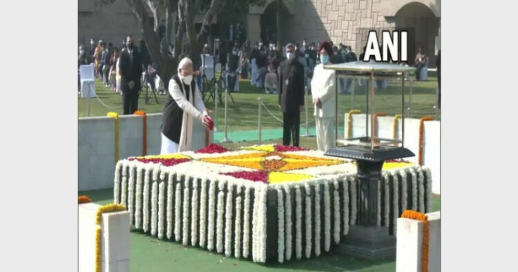 New Delhi: Prime Minister Narendra Modi on Monday paid floral tribute to Mahatma Gandhi at Rajghat in New Delhi on the 74th death anniversary of the father of the nation.