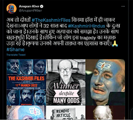 Reacting to Delhi Chief Minister’s crude statement, actor Anupam Kher, who played the lead role in The Kashmir Files and won over film buffs by depicting the plight of minority community during the 1990s genocide and exodus has said, “After Kejriwal’s statement, I think every true Indian should go and watch this film in the theatre. The only way you can give a resounding response to his insensitivity is by collecting more money and connecting with more people from Kashmir.”