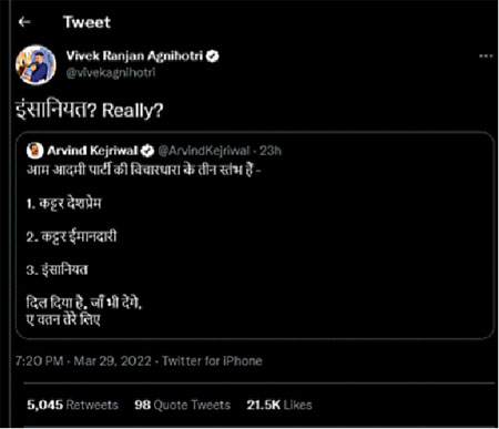 As Delhi Chief Minister Arvind Kejriwal recently said in the Assembly that hardcore patriotism, honesty and humanity are the pillars of the Aam Aadmi Party’s ideology, Bollywood filmmaker Vivek Agnihotri could not quite agree on the point of ‘humanity’ and raised doubts on social media. The tweet comes after Kejriwal was accused of insulting Kashmiri Pandits during his Assembly speech. Earlier too, Agnihotri reacted to Kejriwal’s statement on making The Kashmir Files tax-free and said, “Many people even want God should come to earth.” He further said, “There are people who are fools, then there are mad and then there are idiots. All these three categories of people should be avoided; they should not be answered.”
