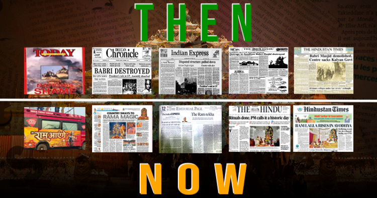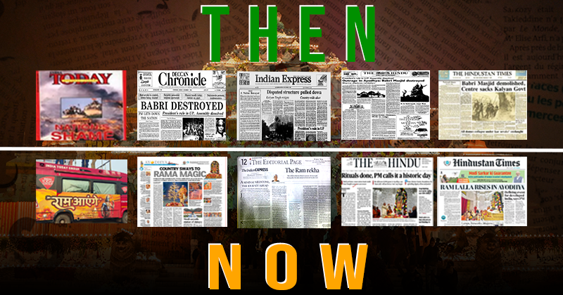 The transformation in media coverage of Ram Lalla’s Pran Pratishtha is vividly reflected in the evolving headlines of prominent newspapers. The Hindustan Times shifted from called the demolition “National Shame” to a celebratory tone with “Ram Lalla rises in Ayodhya.” Another newspaper Deccan Chronicle shifts its narrative from “Babri Destroyed” to “Country Sways To Rama Magic” on its front page, reflecting a change in perspective.