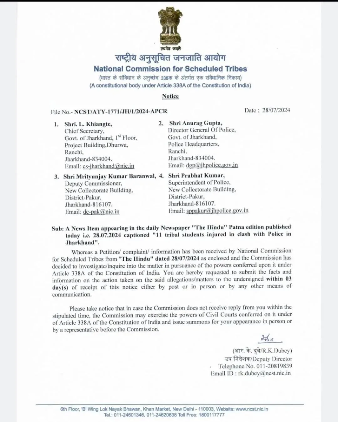 The commission while issuing notices to the Chief secretary of the State, L. Khinagte, Director General of Police, Jharkhand, Anurag Gupta, Deputy Commissioner of Pakud, Mritunjay Kumar Barnwal and Superintendent of Police (Sp) Pakud, Prabhat Kumar has instructed to submit a report on to the matter within three days.