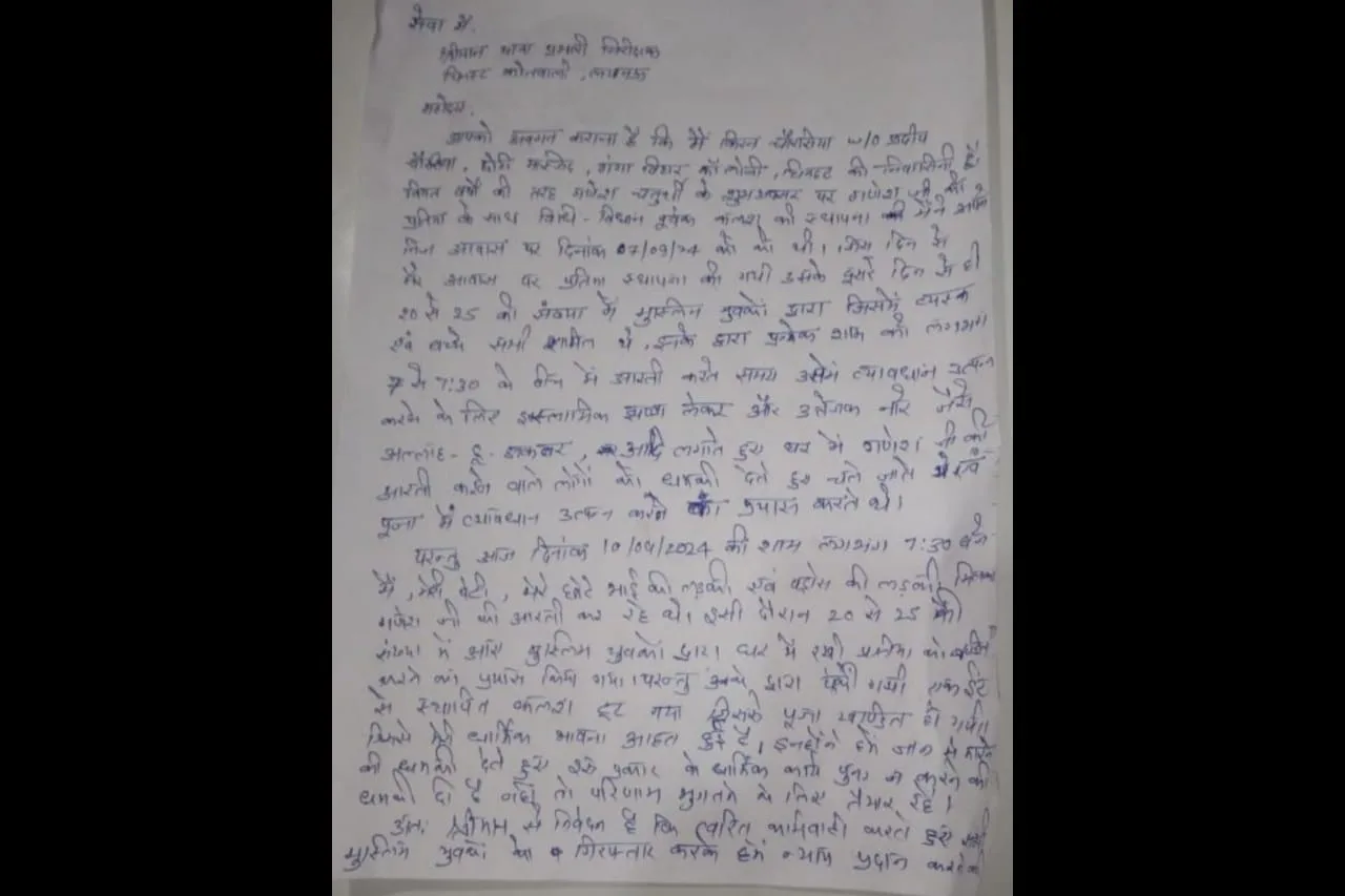 As per a copy of the complaint obtained by Organiser, Kiran Chourasiya, wife of Pradeep Chourasiya, stated to the police, “On September 7, I did the sthapna of Ganesh Ji at my house in a small pandal like every year. The locals would assemble around 7-7:30 every day to perform the arti. However, at the same time, the local Islamists, in numbers around 20–25, would gather and began raising provocative slogans like ‘Allahu Akbar’ among others, and then leave.”