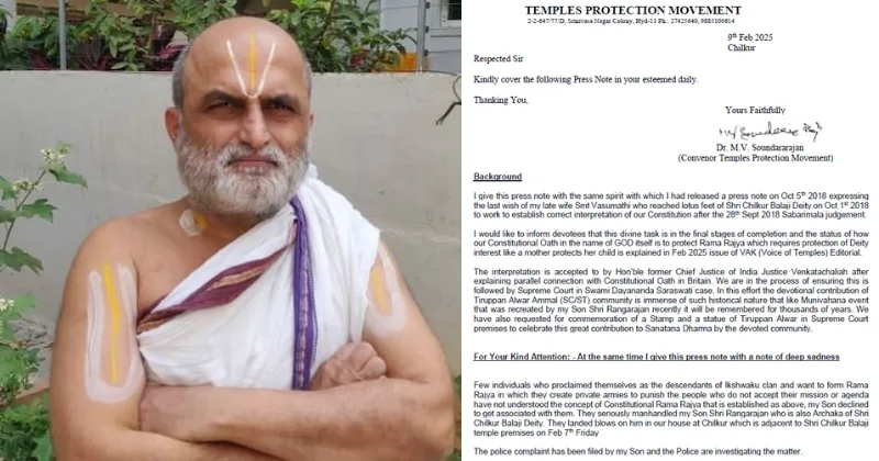 In a brazen and unprecedented act of violence, Shri Rangarajan, the revered Archaka (priest) of the iconic Shri Chilkur Balaji Temple, was brutally assaulted within the sanctity of his own home, adjacent to the temple premises, on the evening of Friday, February 7th. This shocking attack has sparked outrage and disbelief among the temple’s vast devotee community.
