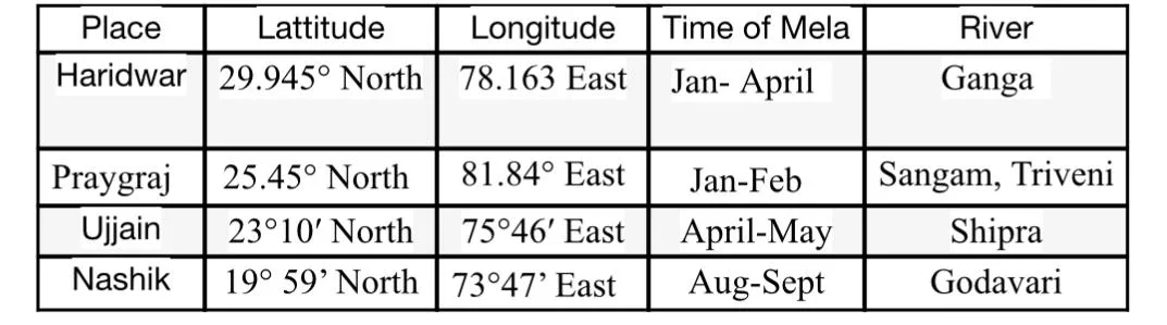 Table 1- Locations of Kumbh Mela with their geographical coordinates