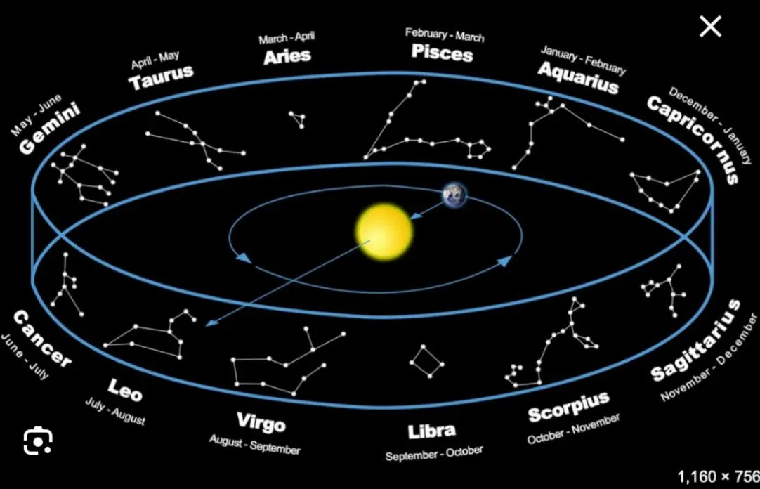 Figure 2 – Schematic diagram of Constellations in the Northern Hemisphere (the yellow sphere is the Sun, smaller one is Earth, seen from Earth). In this picture, the Sun is seen in Leo from Earth (in July-August), and it will be in Capricorn in December-January.