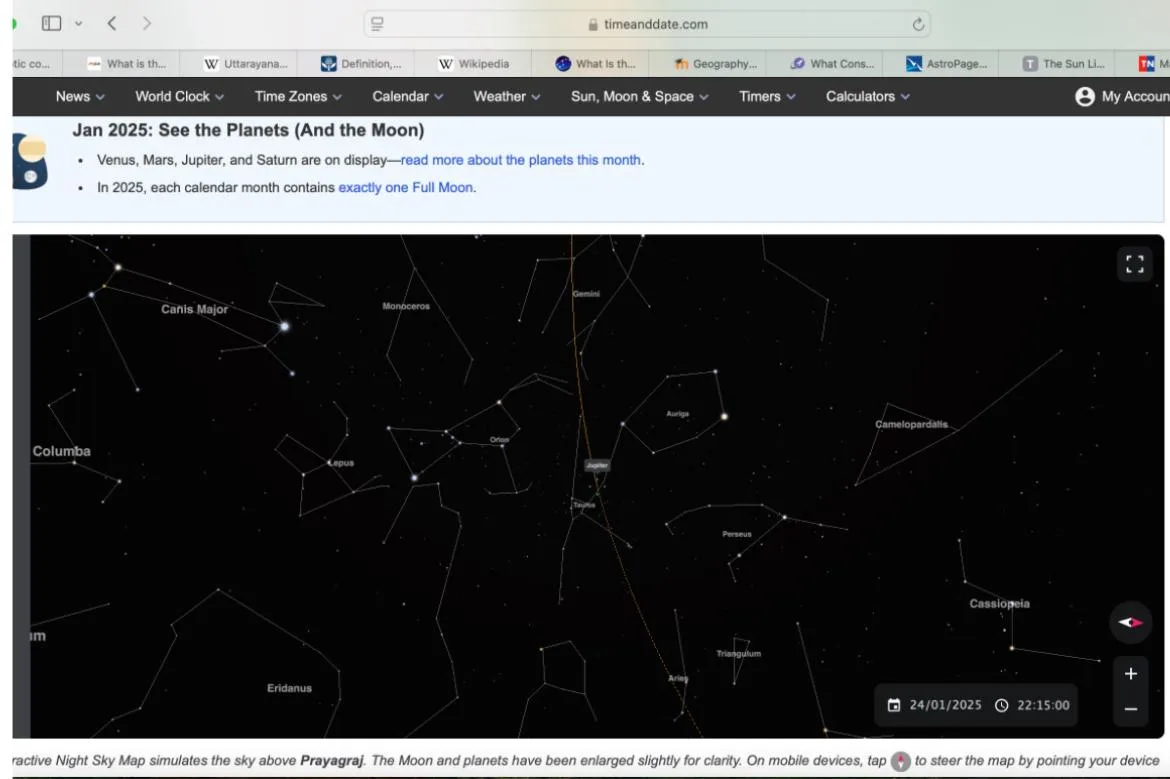 Figure 3 – Photo of real-time Night sky map at Prayagraj, on January 25, 2025. Jupiter can be seen in Tauraus, (Mahakumbh 2025 position) taken from timesanddate.com