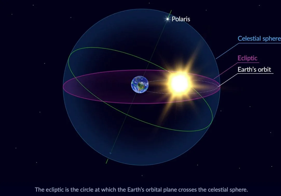 The apparent path of the Sun, as it appears in the sky from earth, is called Ecliptic. It is observed as an imaginary circle on the celestial sphere. The plane containing the Earth’s orbit is called the Earth’s orbital plane. The celestial sphere is an imaginary sphere centred on our Earth, which represents the appearance of the sky from our planet. It is like a globe with stars, planets etc. Thus, Ecliptic is the circle at which the Earth’s orbital plane crosses the celestial sphere.