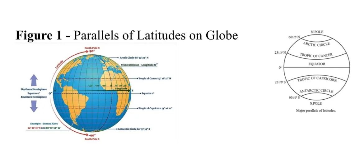 The imaginary parallel circles drawn on earth, parallel to the equator are called “Latitiudes”. Equator is at 0 degree latitude. Prime meridian is imaginary vertical line along the axis of the earth, down from its North to South, and Greenwich meridian line is at 0 degree longitude. Longitudes are measure of east or west of the prime meridian, from north pole to south pole. Latitude is the measurement of distance north or south of the equator. So, latitude of the North Pole is 90 degree North, while that of south pole is 90 degrees South. These circles of latitude are also called parallels, and there are 2 of them that are mainly used to define the correlation of position of the Sun, Earth and climate.