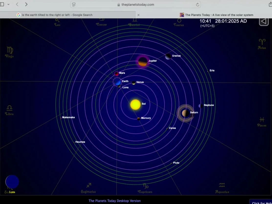 Figure 7 – Position of Jupiter, Sun and Earth nearly in opposition, on 28, January 2025. Jupiter is in Taurus, Sun near Capricorn (constellation of Mahakumbh 2025), taken from theplanetstoday.com