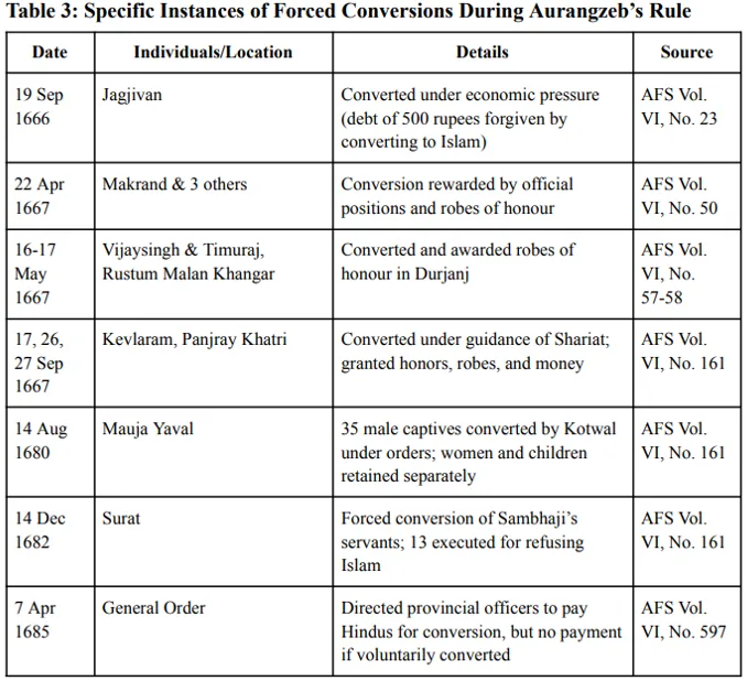Such instances demonstrate that Aurangzeb’s policies were not merely about territorial conquest but also about the systematic “Islamisation” of the subcontinent. Forced conversions, backed by the threat of violence, served as a method of ethnic cleansing that would haunt Hindu collective memory for centuries (AFS, Vol. 6, No. 57).