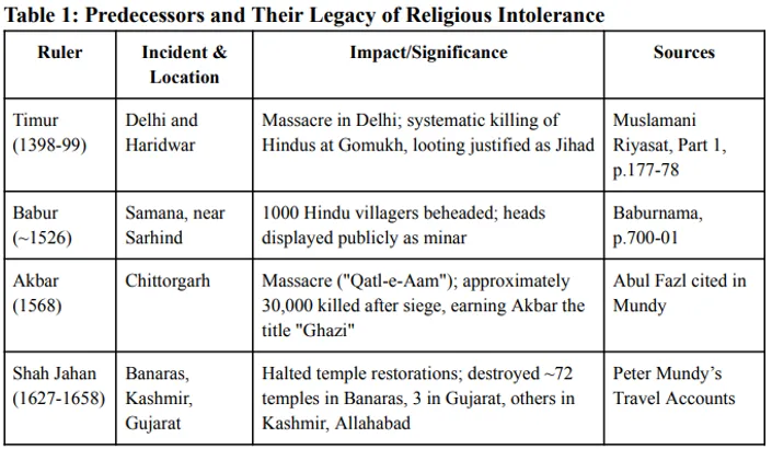 Together, these early examples of Islamic conquest provided the ideological and practical framework for a ruler who would later take the policies of terror to new extremes. Aurangzeb, far from being an anomaly, was the logical culmination of this brutal prelude. (Summarised in the table):