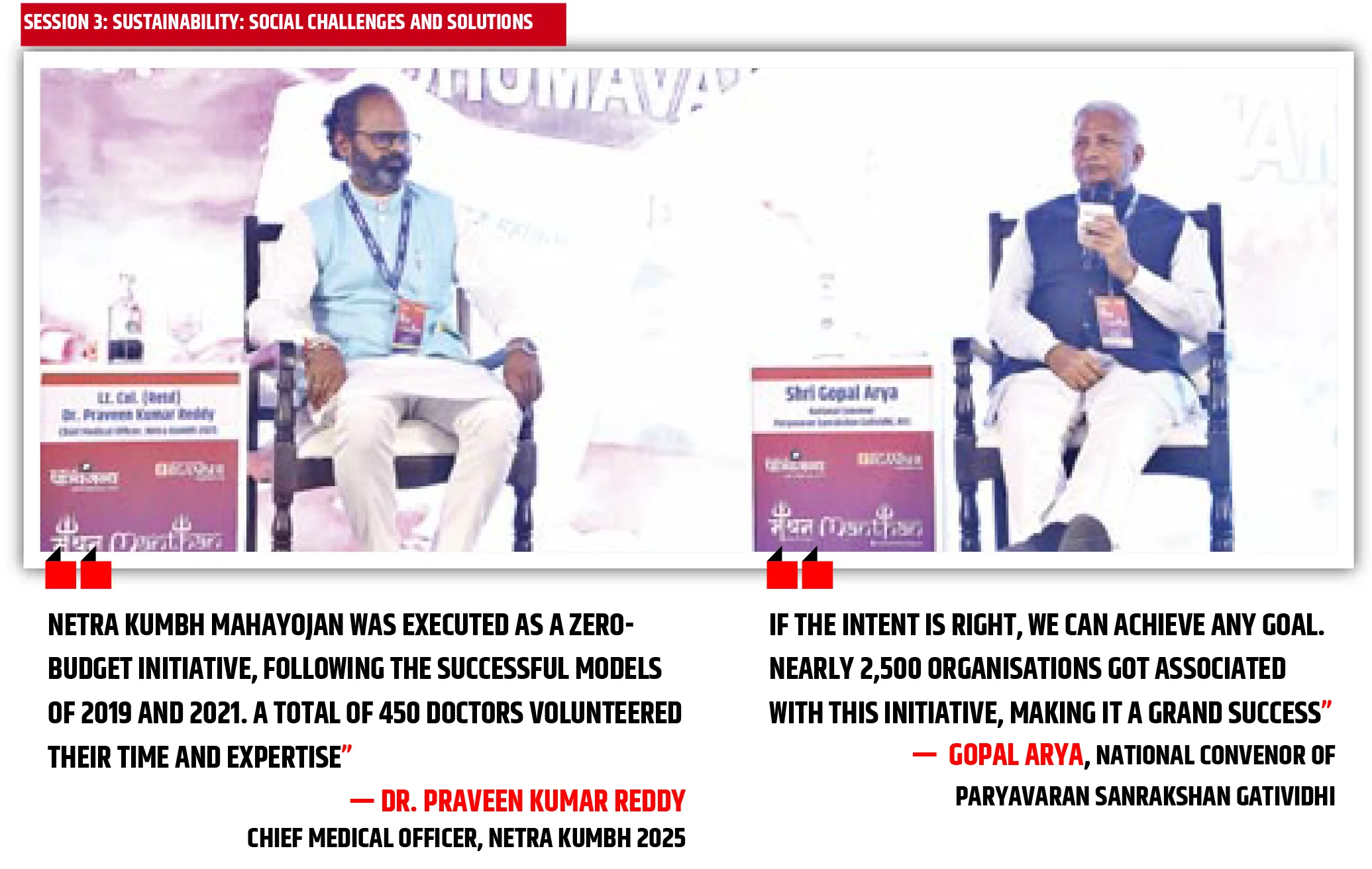 The third session titled ‘Sustainability: Social Challenges and Solutions’ was graced by Gopal Arya, National Convener, Paryavaran Sanrakshan Gatividhi of Rashtriya Swayamsevak Sangh (RSS) who shared insights into how various environmental initiatives achieved massive success without any financial investment in this Mahakumbh Lt Col (Retd) Dr Praveen Kumar Reddy, Chief Medical Officer, Netra Kumbh RSS discussed the inspiring journey of the Netra Kumbh, medical camp dedicated to eye care, which was organised on the sidelines of the Mahakumbh.