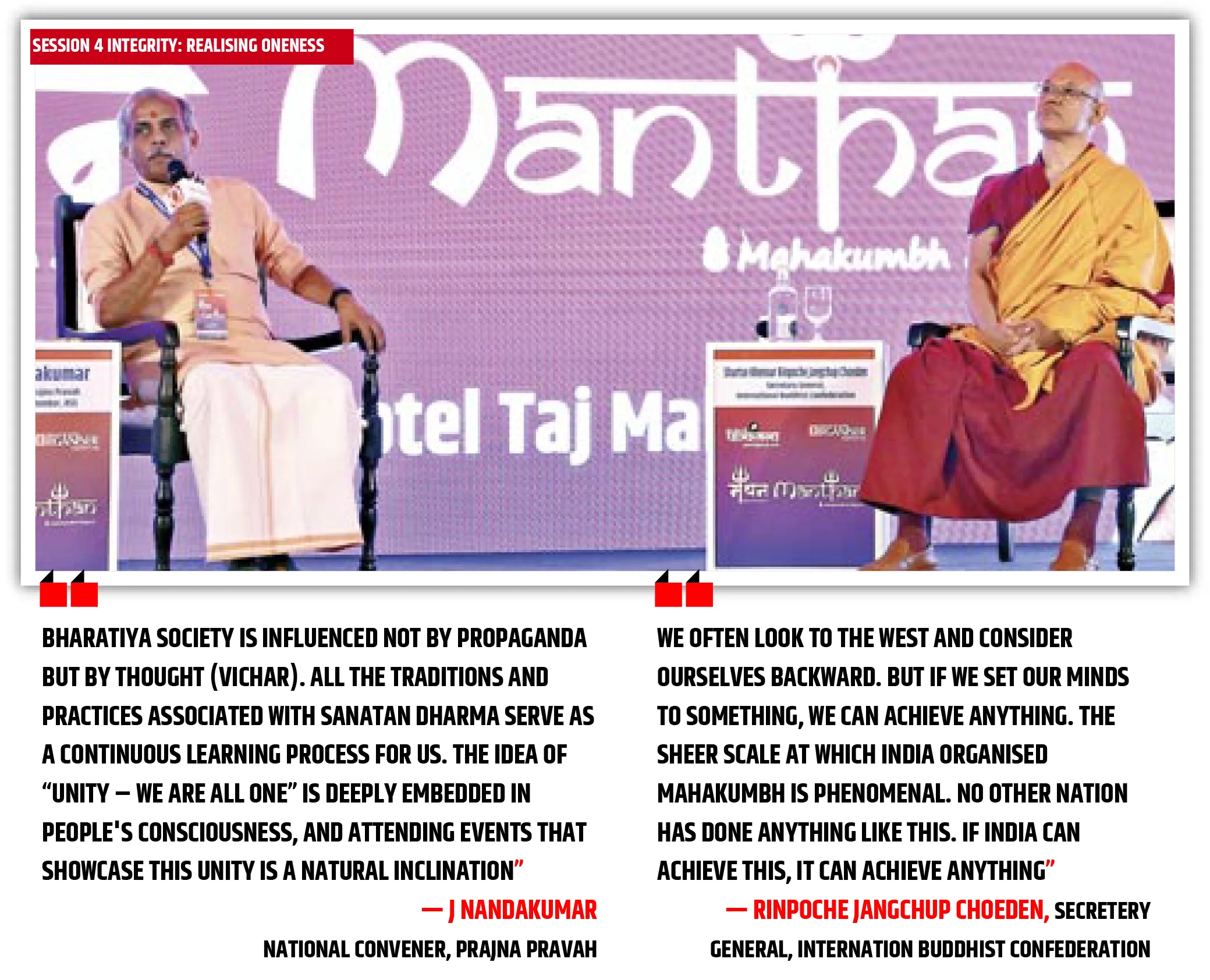 In the fourth session titled “Integrity: Realising Oneness”, senior RSS Pracharak and National Convenor of Prajna Pravah J Nandakumar highlighted the historical continuity of the Kumbh Mela, emphasising that it is an uninterrupted spiritual phenomenon that cannot be viewed in isolation. Rinpoche Jangchup Choeden, Secretary General, International Buddhist Confederation reflected on the diversity within Sanatan Dharma, mentioning that while sects, for instance, Shaivites and Vaishnavites may have theological differences, they respect each other’s traditions, that’s what makes Bharat unique.