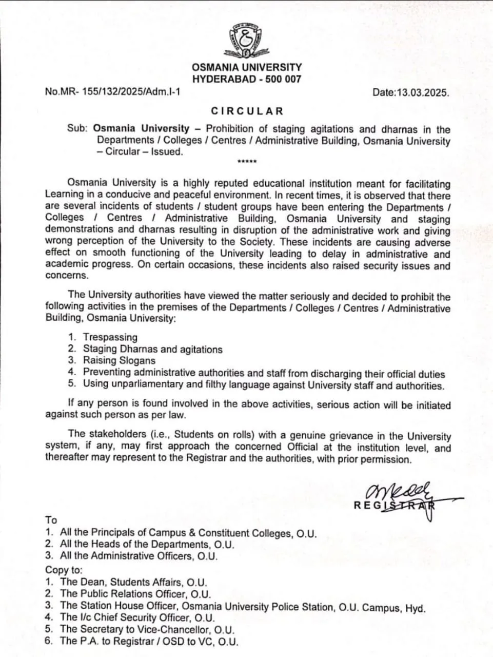 A circular issued by the Osmania University Registrar on March 13 announced a ban on protests and demonstrations within university premises, including departments, colleges, centres, and administrative buildings. The notice cited concerns over demonstrators allegedly trespassing, chanting slogans, obstructing university officials and staff from performing their duties, and using inappropriate language against them.