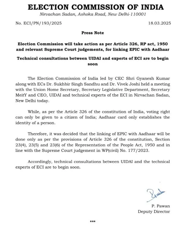 On March 18, 2025, the Election Commission (EC) announced a major move to curb electoral fraud and fake voters by linking Aadhaar numbers with Electoral Photo Identity Cards (EPIC). The Commission revealed that it would soon begin technical consultations with the Unique Identification Authority of India (UIDAI) to implement this linkage.