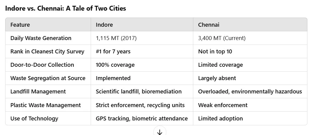 Indore, the commercial capital of Madhya Pradesh, has set a national benchmark for waste management. The city has been ranked India’s cleanest city for seven consecutive years under the Swachh Survekshan rankings. Unlike Chennai, Indore has successfully implemented door-to-door waste collection, waste segregation at source, mechanized road sweeping, and efficient landfill management.