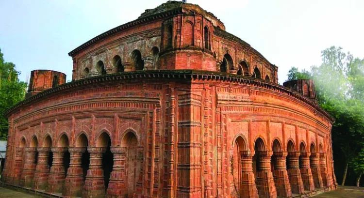 In 1664 Nayeb Dewan Ramnath Bhaduri built this temple on the model of Kantajis Mandir in Dinajpur. The temple is known as Navratna Mandir because it has nine ratna-spires carved out of terracotta. This 15.4 mt. square temple is surrounded by itsuriki wall. The temple is full of medieval artefacts and has an entrance on the east side, and a staircase on the north side of the Kuthuri. Above the central worship hall of the Navratna Mandir is another room with a balcony. Besides, there are many stories surrounding the pond located next to the Navratna Mandir.