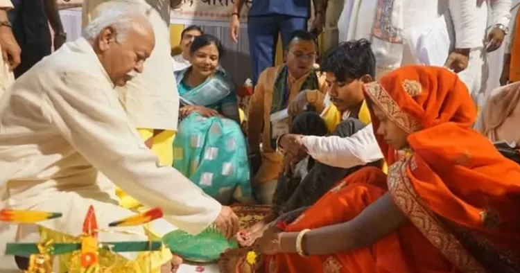 In an act that broke social barriers and inspired thousands, Dr Bhagwat washed the feet of Rajwanti, a Vanvasi bride from Jogidih village in Sonbhadra district, before solemnly offering her hand in marriage to Aman, a Vanvasi groom from Renukoot. Referring to Rajwanti as his daughter, the RSS Sarsanghchalak gave a symbolic wedding gift (neg) of Rs 501 and gently told Aman, “Take good care of my daughter and keep her happy always.”