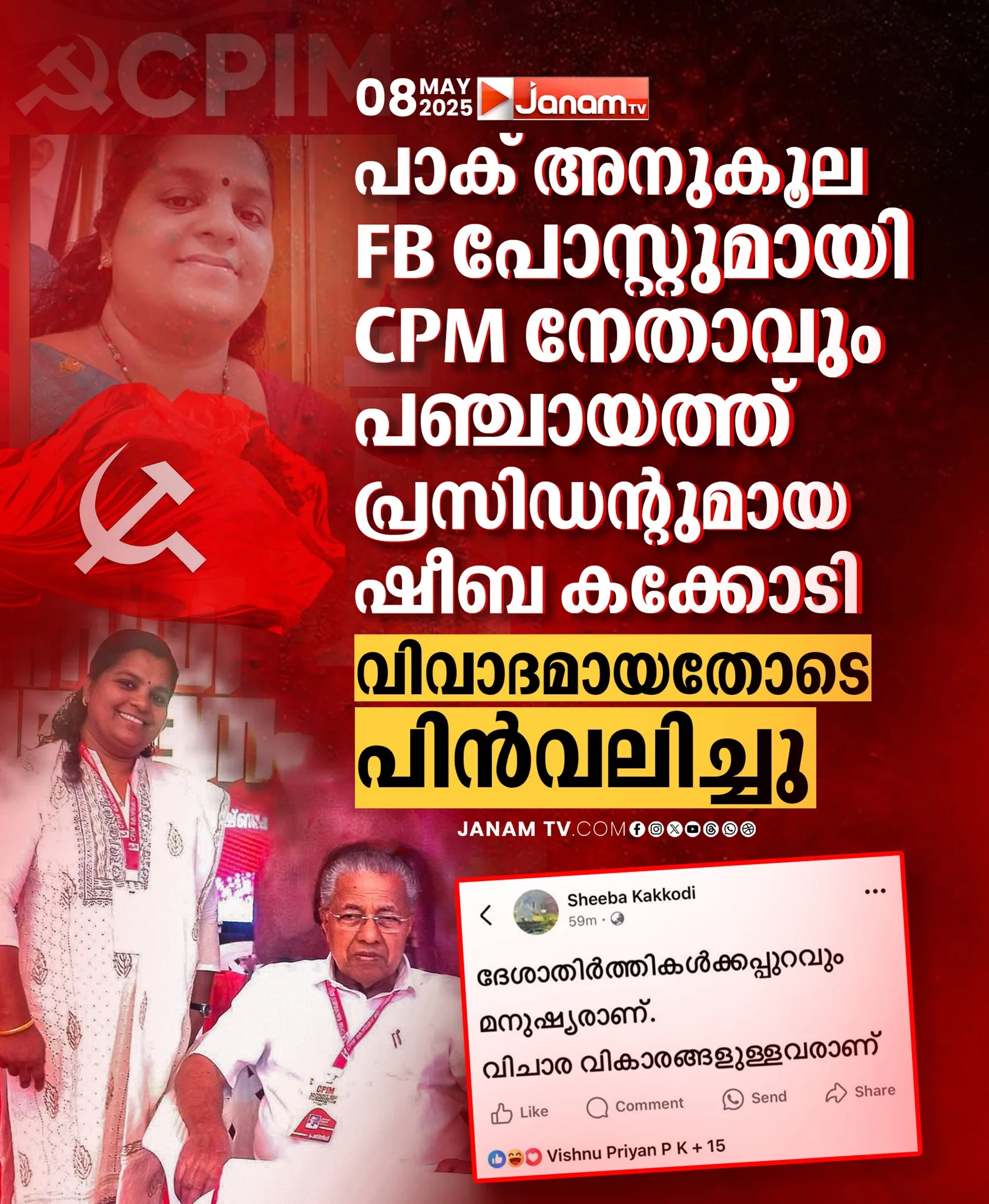 In yet another controversy highlighting the Communist Party of India (Marxist)’s ambiguous stance on national issues, K.P. Sheeba, CPM leader and President of the Kakkodi Panchayat in Kozhikode, sparked outrage with a Facebook post on 7 May 2025 seen as sympathetic to Pakistan. She wrote: “Deshathirthikalkkumappuram manushyaraanu”, meaning ‘people across the border are human beings too; they do have grief and sentiments’. As soon as the post became controversial, Sheeba, a close associate of senior CPM leaders, deleted it. Her picture with the state Chief Minister, Pinarayi Vijayan, speaks volumes about her proximity to the party echelons.