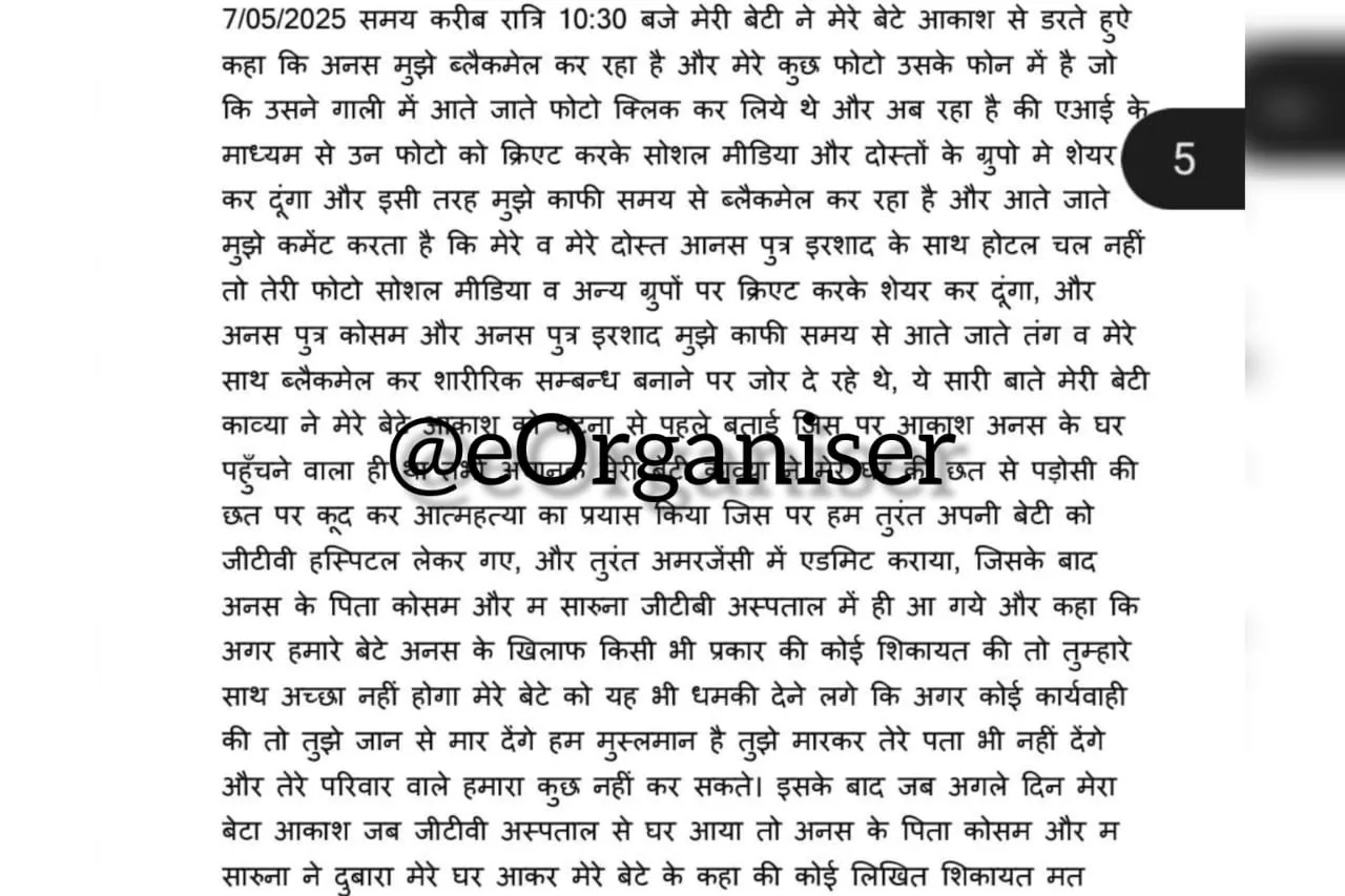 Despite the intimidation, Rakesh Kumar refused to back down and lodged a formal complaint with the police, accusing Anas, Kosam, Saruna, and Anas (son of Irshad) of blackmail, harassment, and abetment to suicide. The accused have been booked under Sections 352, 351(2), and 62 of the Bharatiya Nyaya Sanhita (BNS), which pertain to criminal intimidation, abetment of suicide, and related offences. The police have launched a manhunt to apprehend the absconding suspects.