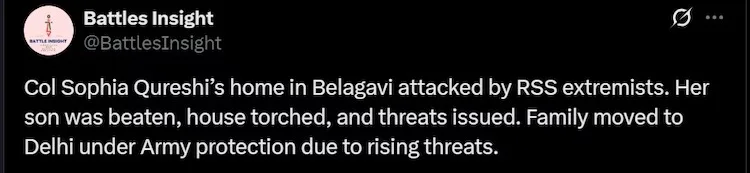 Another user @BattlesInsight wrote: “Col Sophia Qureshi’s home in Belagavi attacked by RSS extremists. Her son was beaten, house torched, and threats issued. Family moved to Delhi under Army protection due to rising threats.”