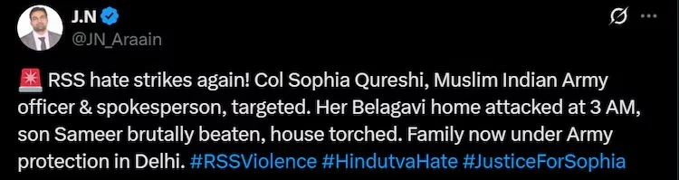 Another user, @JN_Araain, wrote: “RSS hate strikes again! Col Sophia Qureshi, Muslim Indian Army officer & spokesperson, targeted. Her Belagavi home attacked at 3 AM, son Sameer brutally beaten, house torched. Family now under Army protection in Delhi. #RSSViolence #HindutvaHate #JusticeForSophia.”