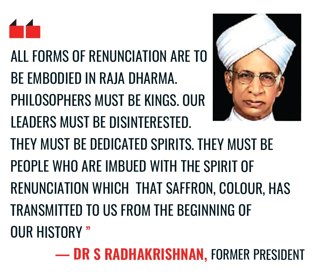 Referring to saffron colour, Dr S Radhakrishnan commented, “All forms of renunciation are to be embodied in Raja Dharma. Philosophers must be kings. Our leaders must be disinterested. They must be dedicated spirits. They must be people imbued with the spirit of renunciation which the saffron colour has transmitted to us from the beginning of our history.”