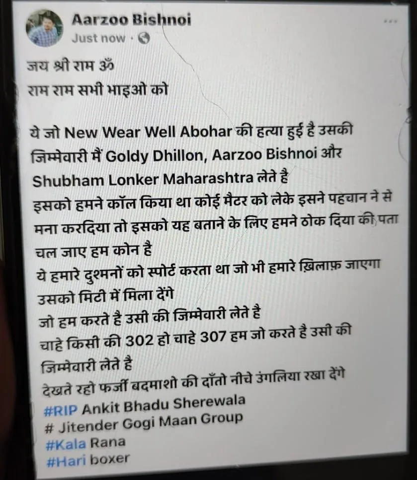 Meanwhile, one Aarzoo Bishnoi has claimed responsibility for the murder through a social media post written in Hindi. The post, reads, “We, Goldy Dhillon, Aarzoo Bishnoi, and Shubham Lonker from Maharashtra, take responsibility for the murder… We had called him regarding a matter, but he refused to recognise us, so we shot him dead to make it clear who we are. He used to support our enemies – whoever goes against us will be crushed to dust. Whatever we do, we take full responsibility.”