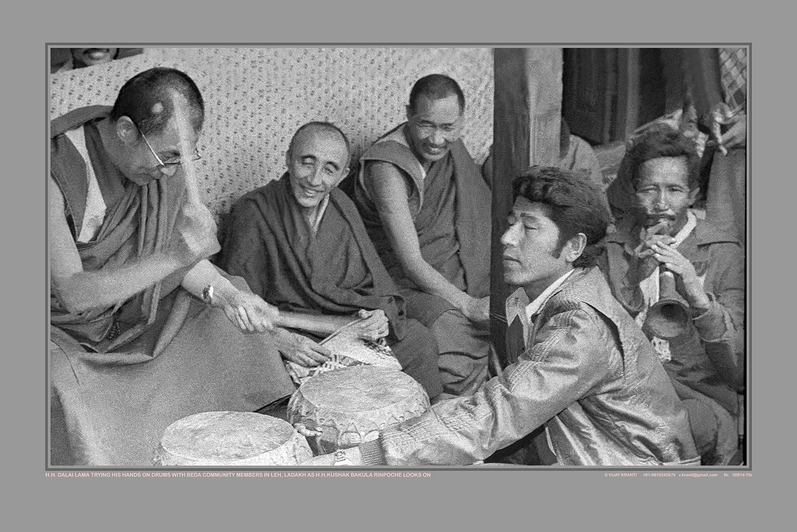Another photo (Sep 1980) depicted the Dalai Lama enthusiastically playing on the traditional drums of a Beda family of Ladakh while Kushak Bakula Rinpoche, the top ranking Buddhist Guru of Ladakh and a large crowd of onlookers are watching him with awe. In Ladakh where the musician community of the Bedas has been suffering discrimination at the hands of the Buddhist clergy, Dalai Lama made it a point to visit a Beda family where he not only had food with the family and played on their drum, but also gave a stinging lecture to the Buddhist clergy about giving a respectable treatment to the Bedas.