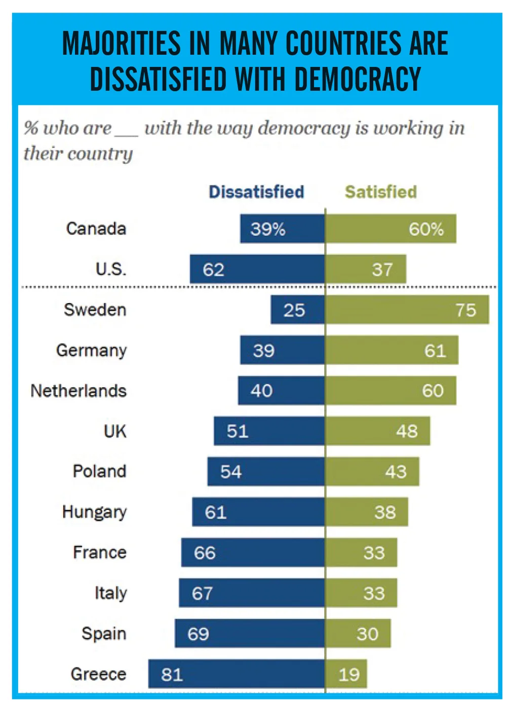 Globalisation has upended this foundation. Since the late 20th century, migration and digital connectivity have introduced diverse ideologies and populations to the world. In 2023, the Organisation for Economic Co-operation and Development reported 135 million migrants in its member countries. It is no secret that drastic population shifts in Europe and the United States have historically been rooted in uniformity, leading to political polarisation and distrust. In 2021, a survey by Pew Research Center found that across 17 advanced economies, a median of 56 per cent believed their political system need significant changes or be completely reformed. Roughly two-thirds or more of the population holds this view in Italy, Spain, the United States, South Korea, Greece, France, Belgium, and Japan. The survey showed 85 per cent of the US population believed so. There is a strong perception in the West that democracy does not serve the interests of ordinary people.