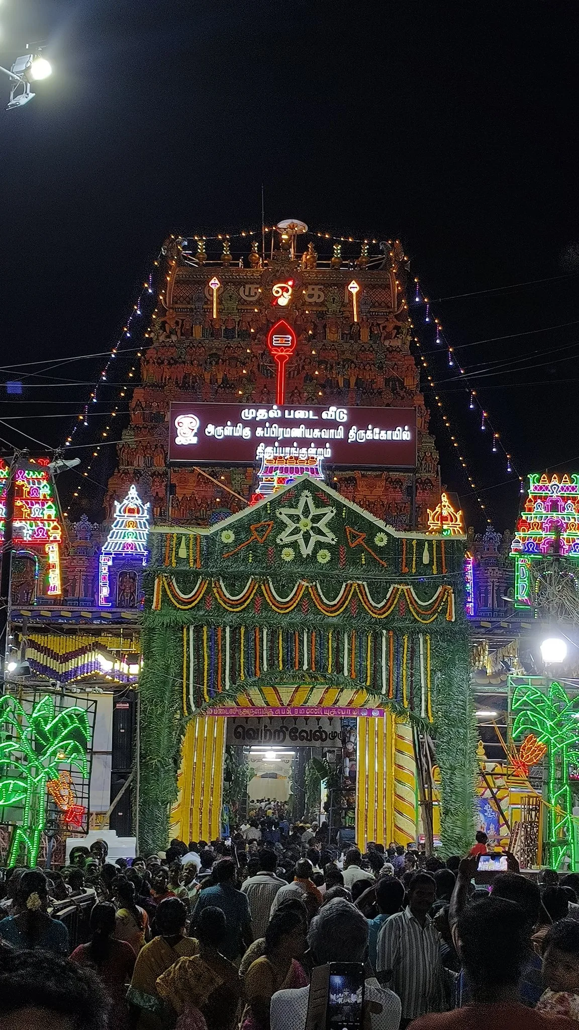 This temple, one of the six abodes of Lord Murugan and second in rank, is managed by the Tamil Nadu Hindu Religious and Charitable Endowments (HR&CE) Department. Following the completion of renovation work, dates were fixed for the grand consecration ceremony. The event began with Yagasala pujas, which commenced days in advance, and was attended by Vedic pandits. The holy water was poured on the kalasams (sacred pots) of the Rajagopuram and other deities at the pre-fixed muhurtham by Sivachariars. Lakhs of devotees attended the event.