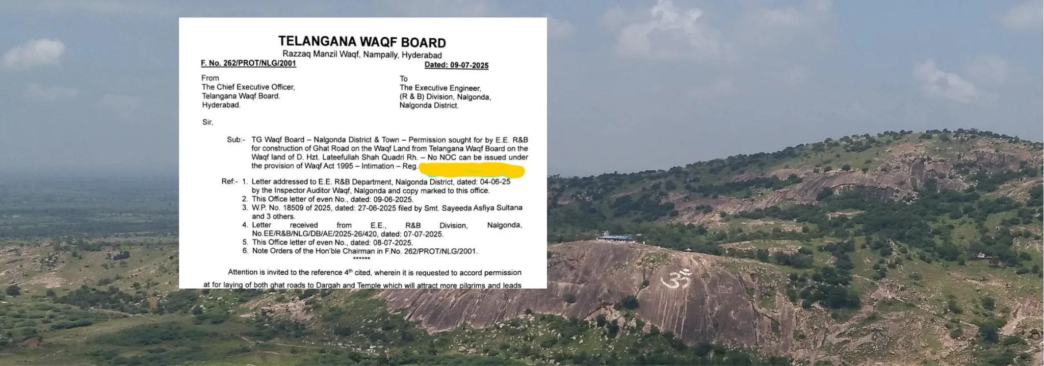 The Telangana Waqf Board has once again sparked controversy by stalling a major public development project, this time a Rs 140 crore ghat road to the ancient Durga Devi Temple and BrahmamGari Math atop Brahmamgaru Gutta, a sacred hillock revered by local devotees for centuries in Nalgonda.
