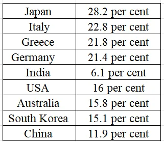 Low TFR Creates Ageing Nations – Due to a decrease in TFR, the young population of a Nation reduces in percentage, and such ageing Nations face many problems – shrinking skilled and young workforce, increased healthcare costs for the ageing population, strain on economy (welfare schemes cost more while productive inputs to the economy shrink). Saving and investments also reduce in size. This hampers economic growth and may lead to an economic slowdown. Some of the countries most affected by an ageing population are Japan, Italy, Greece, Germany, the USA, Australia, South Korea, and China, which have already started facing the blow. The percentage of people above 65 years of age, as per data from 2020 (prb.org), was