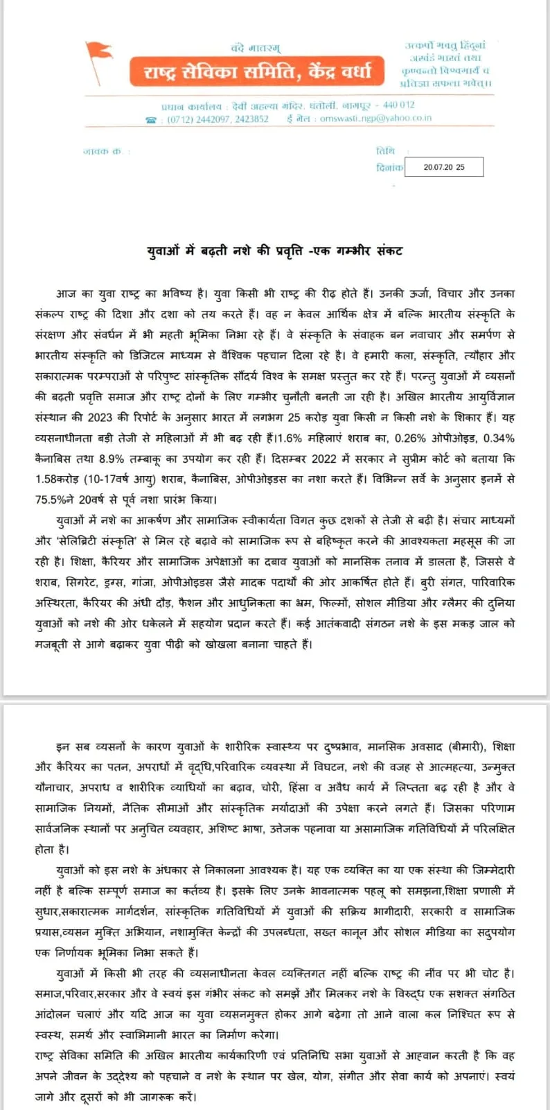 The All India Executive Committee and Representative Assembly meeting (Pratinidhi Sabha) of Rashtra Sevika Samiti also passed a resolution on ‘The Rising Trend of Substance Abuse Among Youth – A Serious Crisis’, in its 3-day meet.
