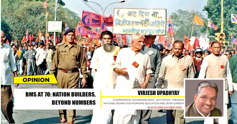 What started with Dattopant Thengadi is still going strong under the leadership of personalities such as Hiranmay Pandya, who have taken BMS to international stages without ever compromising its foundations. The Sangh is not a populist movement; it is a movement characterised by its calm strength and rooted clarity. It is clear from the slogans that describe its essence: