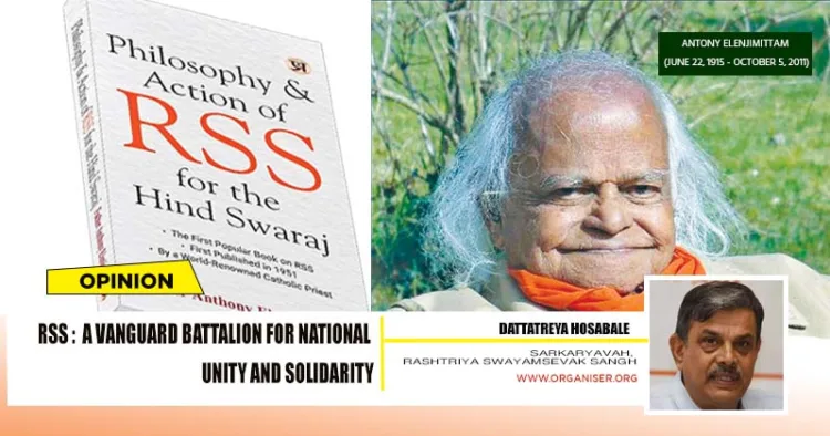 What makes Father Elenjimittam’s book so extraordinary is that it was penned by a Christian priest during a period when the RSS was grappling with an existential crisis. We lacked funds for our dedicated karyakartas and had very few affiliated organisations – only the Akhil Bharatiya Vidyarthi Parishad had just begun in 1949. At that time, the general public had little to no knowledge of the silent, tireless work of RSS Swayamsevaks in society. Father Elenjimittam’s unbiased perspective, driven by a genuine desire for Bharat’s welfare and progress, and his deep appreciation for Bharatiya sanskriti despite his foreign religious background, made his insights truly unique. I urge you to view his arguments within that historical context, especially now, as the RSS approaches its centenary, with millions of Swayamsevaks working across 25 different organisations nationwide. Elenjimittam’s book, written by someone who never even attended an RSS ‘shakha,’ contained truly prophetic observations about the RSS’s future potential.