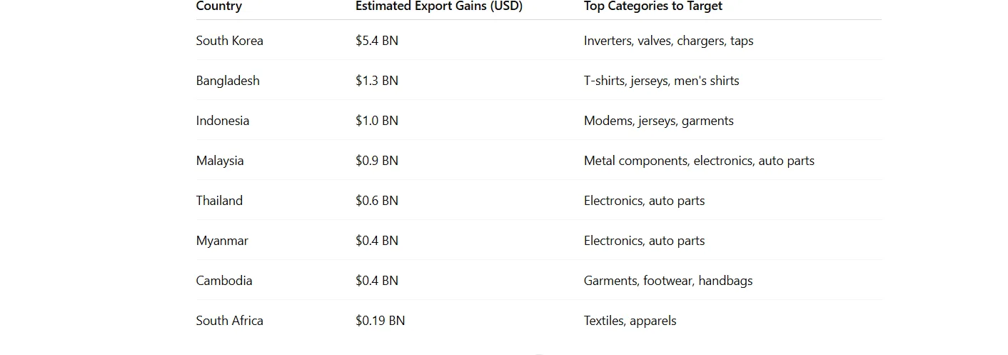 Despite of these critical and sensitive situation we may say that Trump’s tariffs open big windows for Bharat’s exports across multiple sectors. But how? Let’s discuss Bharat’s potential export gains ( country wise) from Trump’s tariffs. According to a Money control analysis –