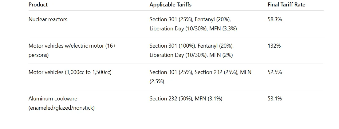 Many of these tariffs are stacked, meaning multiple duties apply simultaneously on the same goods, significantly increasing the overall cost of imports from China.