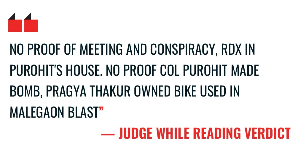 Further weakening the prosecution’s case was the fact that over 40 witnesses turned hostile during the trial. Some even alleged they were coerced by the ATS. Others contradicted earlier statements, questioning the credibility of the investigative foundation itself. As delays mounted, over 30 witnesses passed away before they could be examined. For Lt Col Purohit, the most damning allegations, such as the procurement of explosives and formation of Abhinav Bharat for subversive activity, found no evidentiary backing in court. His defence argued that he was working undercover, informing his Army superiors about the very meetings the ATS later construed as conspiracy. For Pragya Singh Thakur, the initial allegation that her motorcycle was used in the blast collapsed when chain-of-custody and ownership could not be conclusively established. The NIA itself found no credible evidence linking her to the conspiracy.