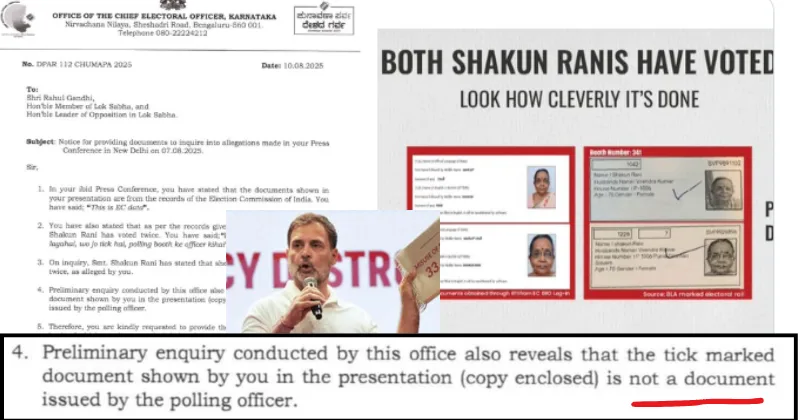 The Chief Electoral Officer (CEO) of Karnataka has issued a notice to Rahul Gandhi, MP and Leader of Opposition in the Lok Sabha, seeking documents to substantiate his claim that a voter cast her vote twice.