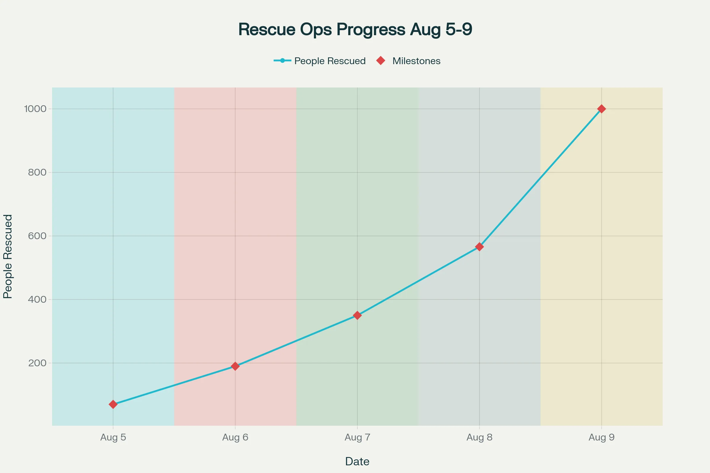 The rescue operations achieved remarkable success in evacuating stranded individuals. By August 9, over 1,000 people had been successfully rescued and evacuated from the disaster zone. The progression of rescues was steady and well-documented: