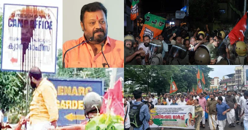 On August 13, the BJP staged a strong protest march to the City Police Commissioner’s office, denouncing the attack on Suresh Gopi’s office and the physical assault on party leaders the previous day. Thousands of party workers participated. BJP State General Secretary Shobha Surendran and former State President K. Surendran addressed the massive gathering. Police stopped the march with barricades before it could reach the Commissioner’s office. The protesters refused to disperse, prompting the police to fire water cannon several times, yet the workers stood their ground and continued their protest.