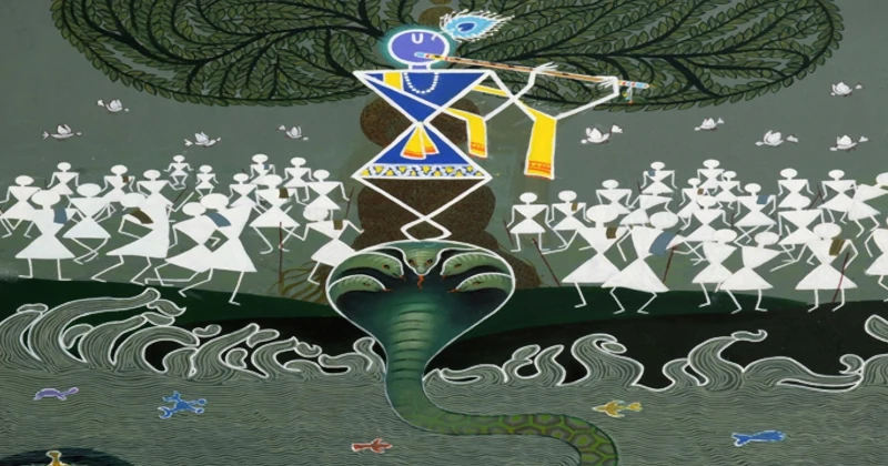 From this rustic and nature-embedded upbringing, we see parallels in the lives of many tribal groups. For instance, whether gauging the continuum of life of the Gond, Santhal, Baiga, or Bhil communities, their lives are aligned with the cycles of the earth. In the economy of the bansuri (flute), in the dance around the fire, in a deep respect for trees, animals, rivers; the people find Krishna as the eternal dweller in the forests.