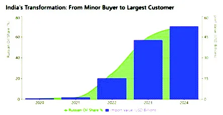 The energy transformation of India during 2021-24 has been one of the most important strategic policy pivots in recent economic history. In 2021, having almost no Russian oil presence, India started its strategic pivot in 2022, quickly garnering the main buyer status in 2023 and becoming Russia’s largest customer by 2024.
