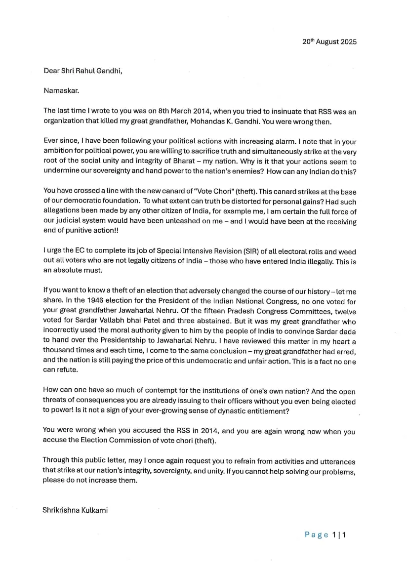 On 20th August 2025, Shrikrishna Kulkarni, great-grandson of Mahatma Gandhi, released an open letter addressed to Rahul Gandhi. Published on his social media account, this letter was not merely a personal communication but a piercing commentary on the Congress scion’s continued pattern of reckless political behaviour. The sharpest thrust in Kulkarni’s note comes in a single, unambiguous line: