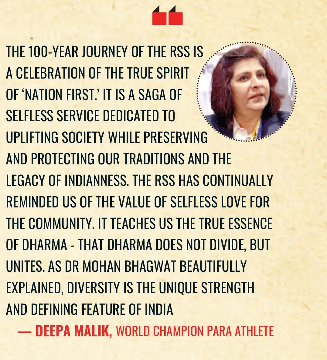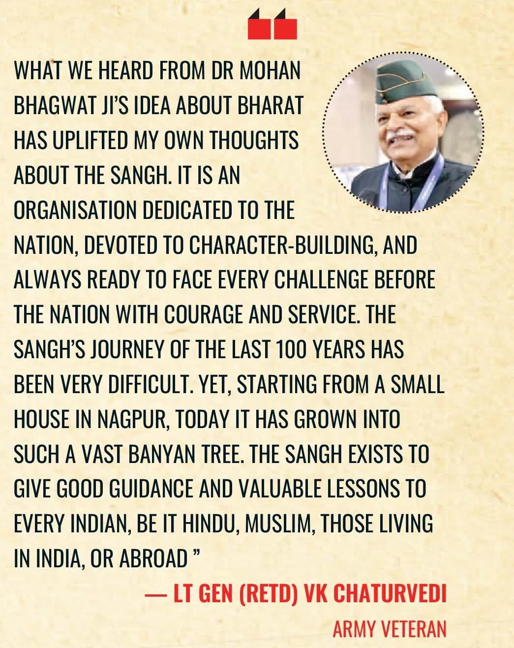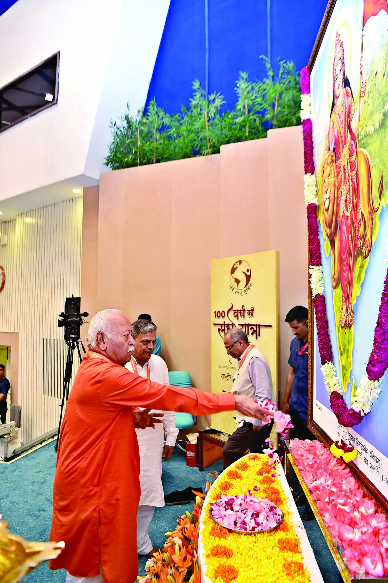 Sangh was formed with Bharat at the centre, and its purpose is for Bharat to become a Vishwaguru. The inspiration for Sangh’s work comes from the call of Bharat Mata Ki Jai, which reverberates at the end of the Sangh Prarthana,” said Rashtriya Swayamsevak Sangh (RSS) Sarsanghchalak Dr Mohan Bhagwat on August 26, while addressing the first day of the dialogue with people from various sections of society. The three-day lecture series, titled 100 Years’ Journey of RSS: New Horizons, was held at Vigyan Bhawan in Delhi from August 26–28, 2025.